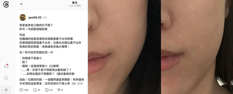 隔着萤幕都能感觉到Threads原po有多感动!毕竟本来以为是开架乳霜,一瓶才NT.1,190,没效果也不觉得痛心,没想到简直是把V脸功能开外挂,只要一週就能让直男老公发现脸变小,这种甜甜价换来高价医美的,用了真心觉得赚超大!不只是保养品,还是女人的!女人投资自己,除了变漂亮,还为了在某个不经意的瞬间,被最熟悉的人看见、被爱看见就是那个让你从的转捩点,身为一儿一夫男子舍监的老婆M编衷心推